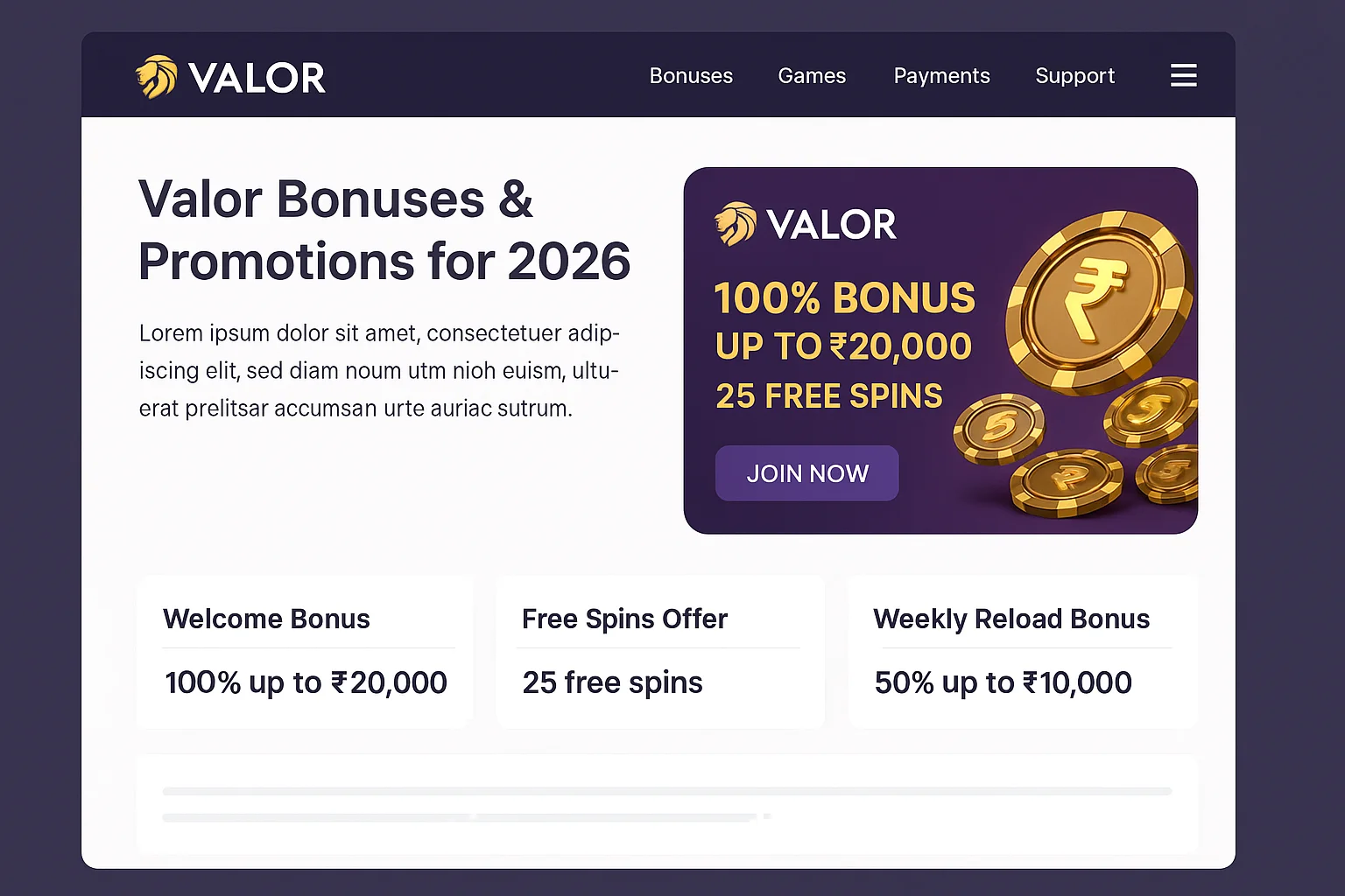 Valor offers a generous 650% welcome bonus for sports betting and 650% bonus for casino games, providing substantial value for new players joining the platform.